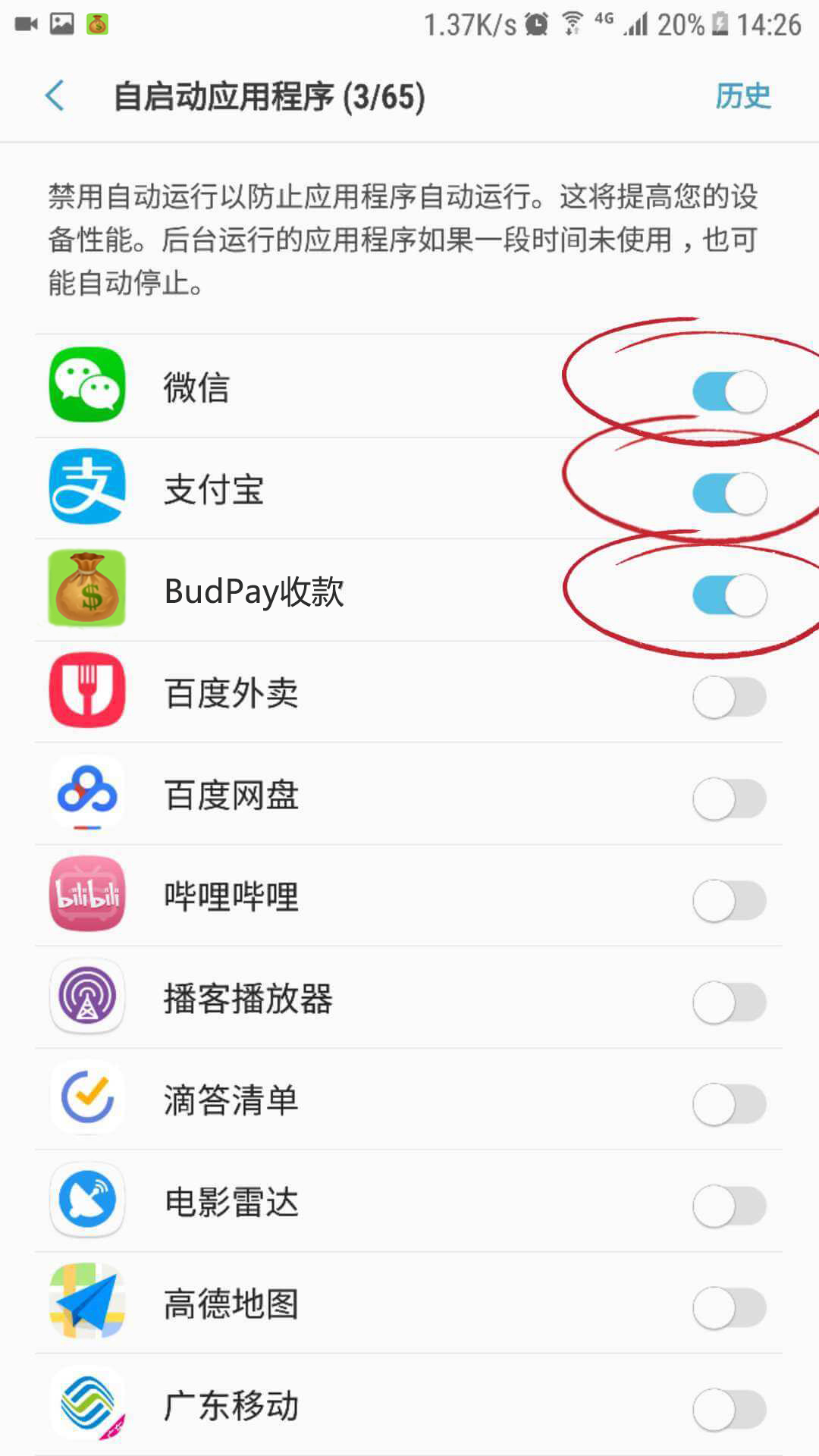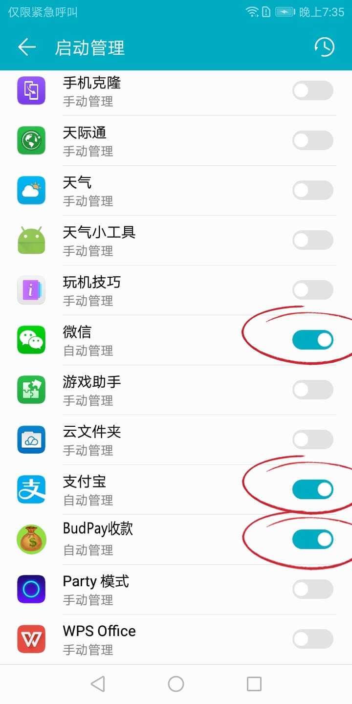 「智能管理器」-「应用程序管理」-「自启动应用程序」- 勾选 OK码支付收款、微信、支付宝 允许自启动。
