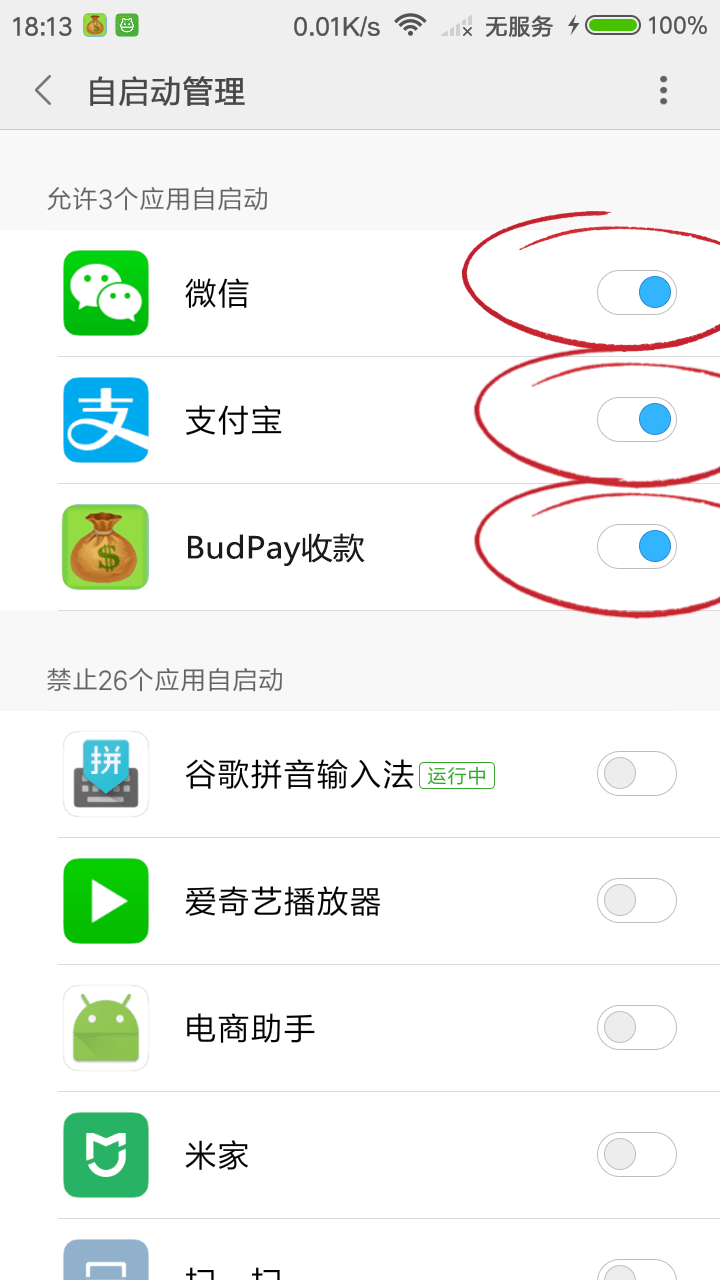 在系统「设置」-「授权管理」-「自启动管理」- 勾选 OK码支付收款、微信、支付宝 允许自启动。